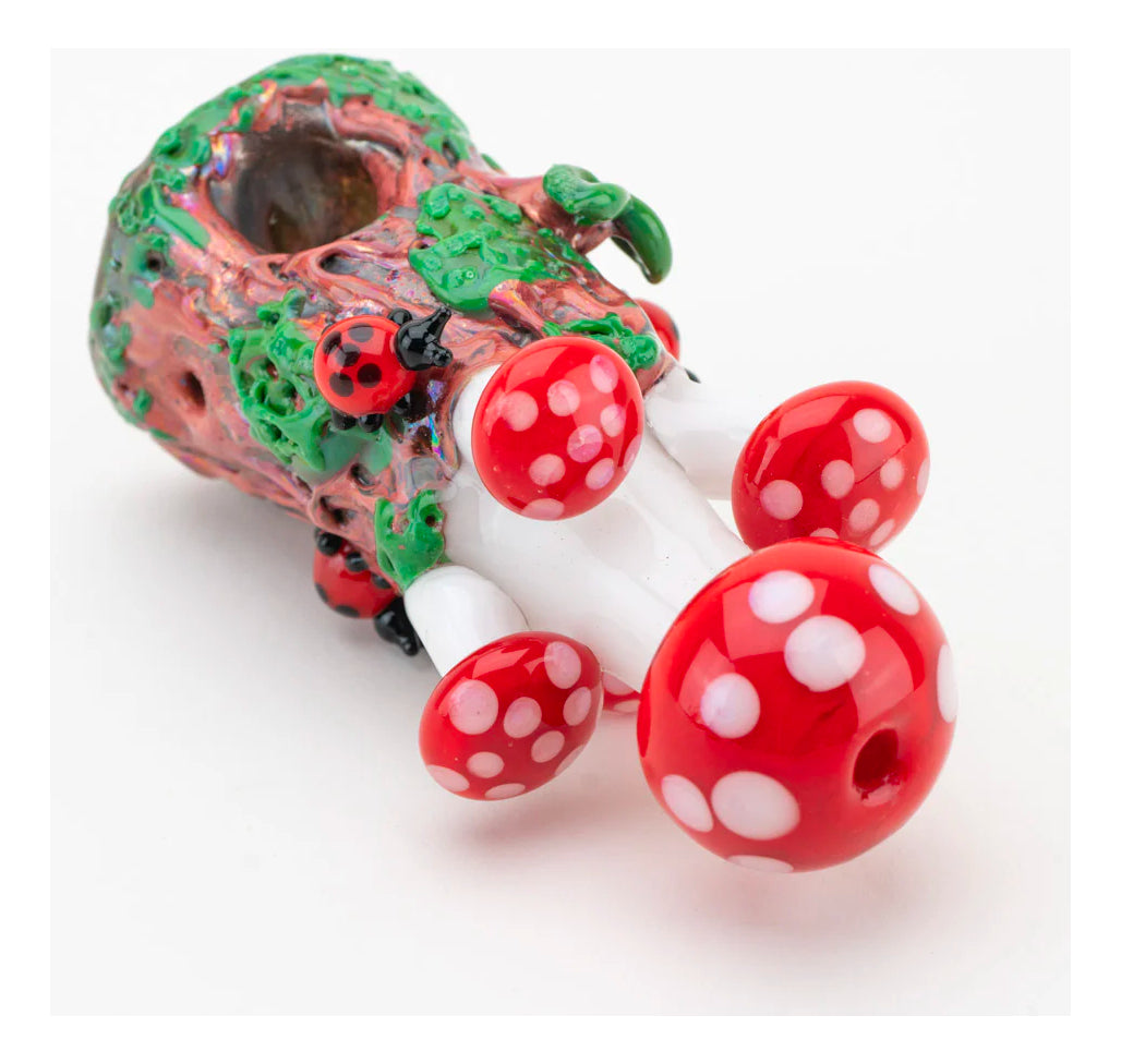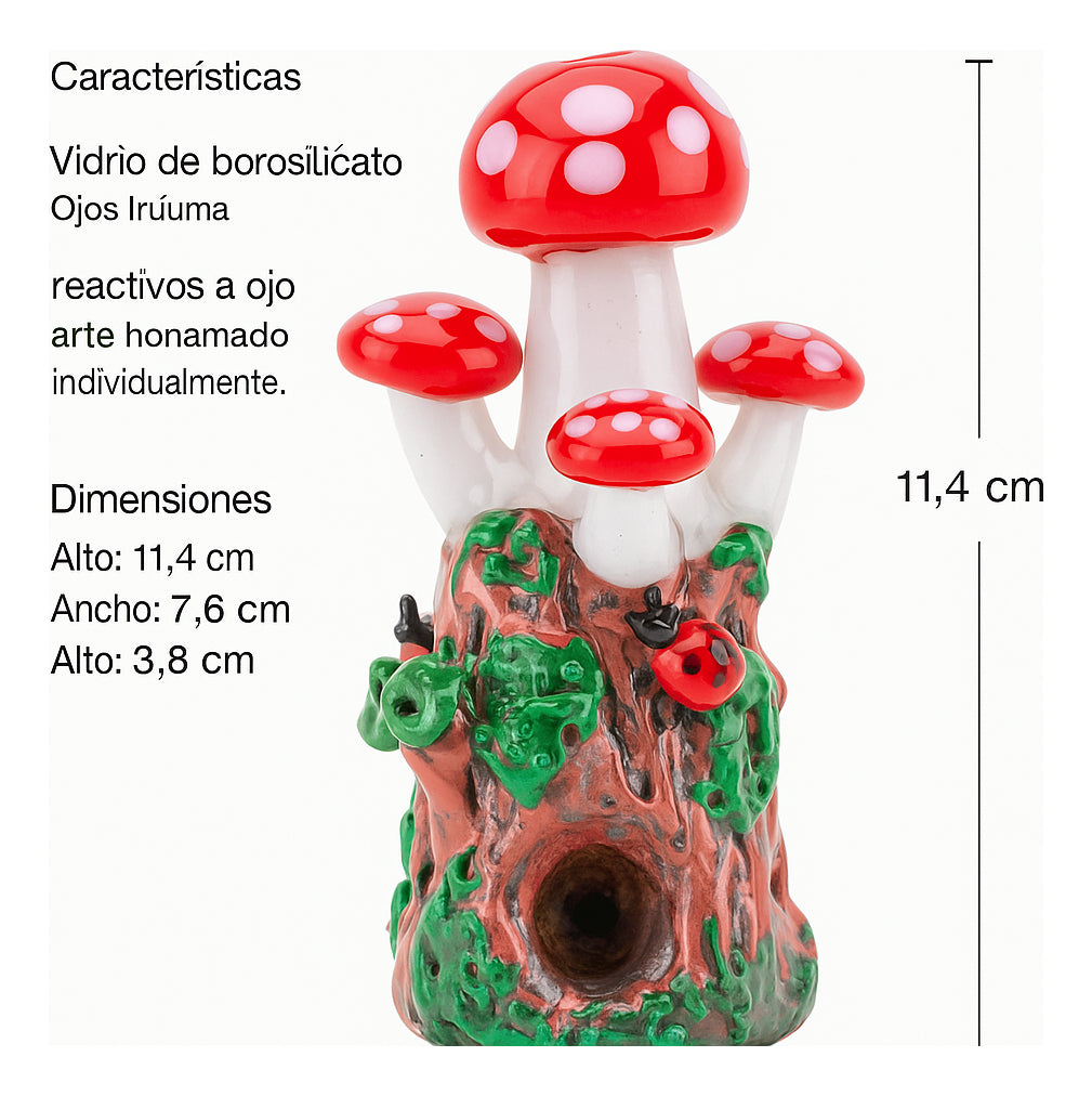 Caracteristicas:* Vidrio de borosilicato* Ojos Illuminati reactivos a los rayos UV* Obra de arte hecha a mano individualmente.Dimensiones:*Alto: 11,4 cm Ancho: 7,6 cmPeso:*110 gramos.