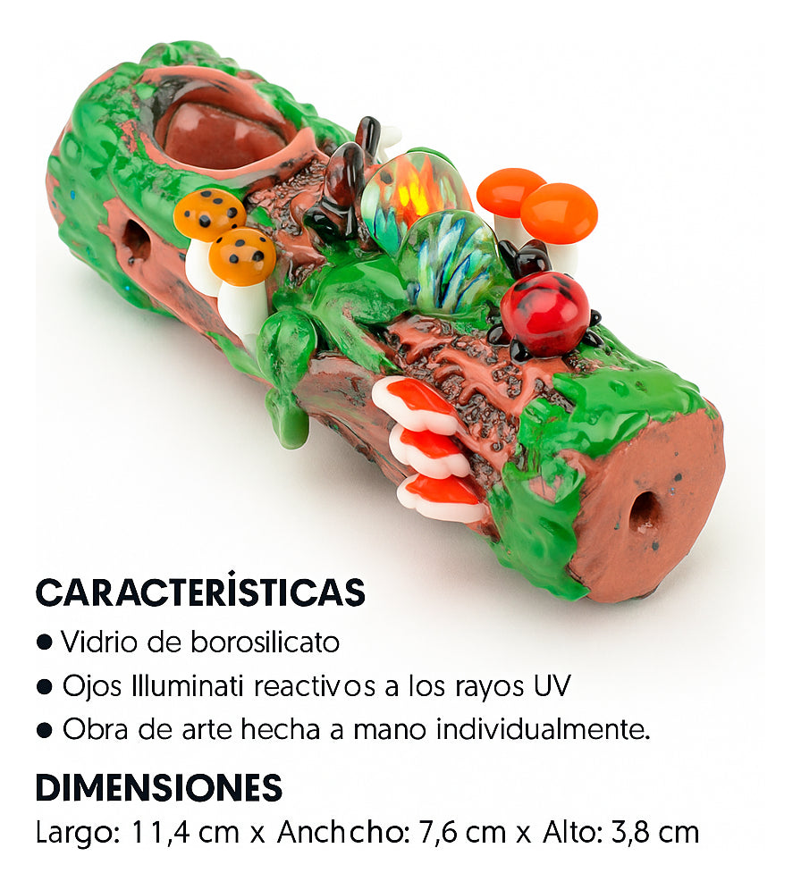 Caracteristicas:*Vidrio de borosilicato*Ojos reactivos a los rayos UV*Obra de arte hecha a mano individualmente.DIMENSIONES:* Largo: 11,4 cm x Ancho: 7,6 cm x Alto: 3,8 cmPESO:*102 gramos.