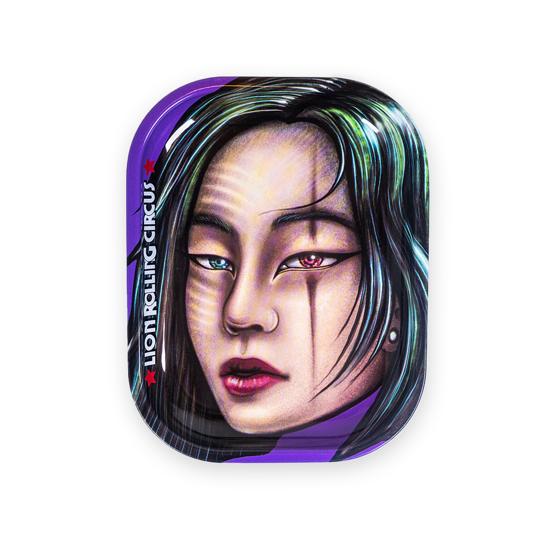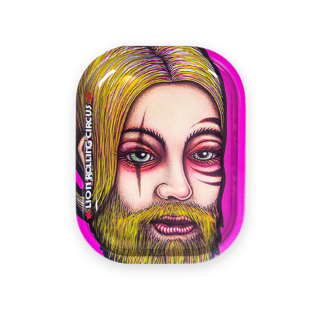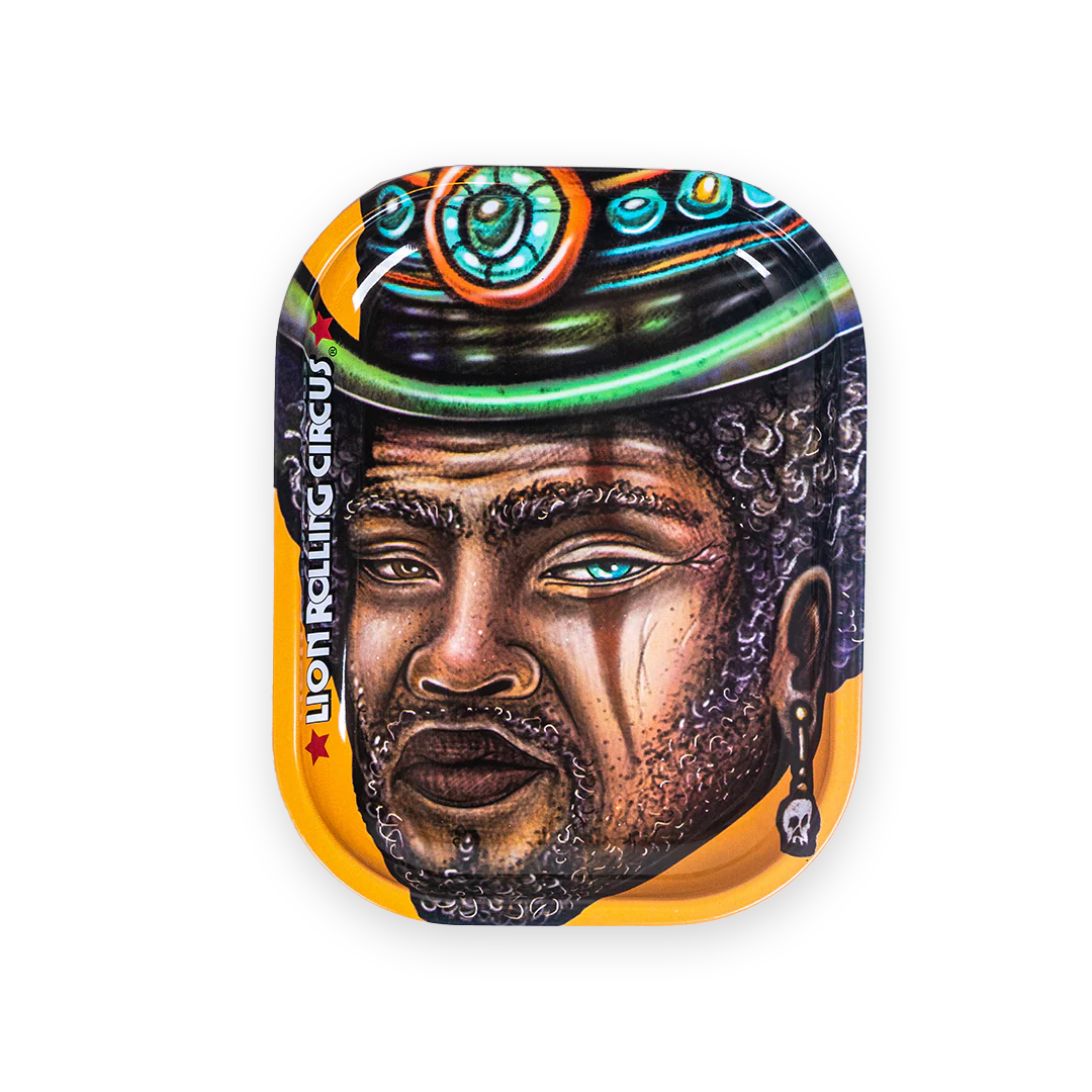 Charola metálica resistente con bordes elevados, tamaño mediano y diseño con el icónico logotipo de Lion Rolling Circus.