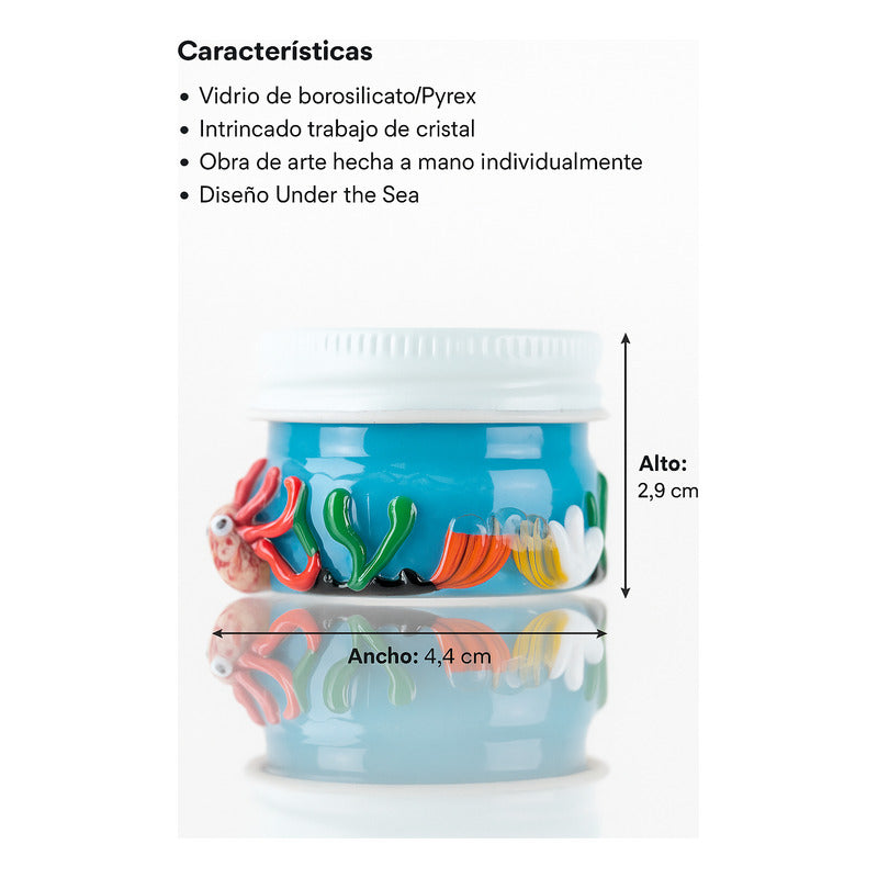 El Tarro para Terp Bajo el Mar de Empire GlassWorks te sumerge en una experiencia fresca y divertida inspirada en el océano. Fabricado en vidrio de borosilicato/Pyrex, cuenta con un sellado hermético que mantiene tus terps y concentrados protegidos y frescos. Su intrincado trabajo artesanal presenta un encantador diseño Under the Sea con pulpo y coral, convirtiendo cada pieza en una obra de arte hecha a mano. Con 2,9 cm de alto, 4,4 cm de ancho y un peso de 55 gramos, es compacto, resistente y perfecto para añadir un toque marino a tu colección.
