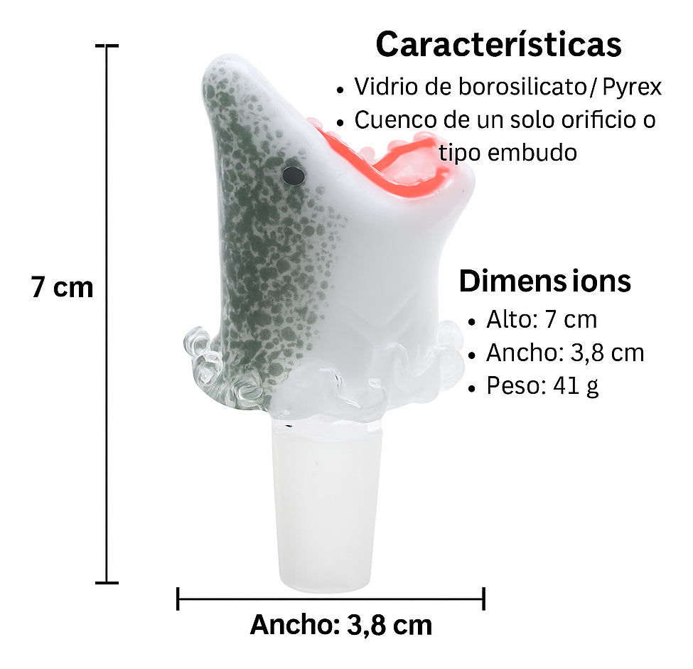 Características:* Vidrio de borosilicato/Pyrex* Cuenco de un solo orificio o tipo embudo* Obra de arte hecha a mano individualmente.Dimensiones:* Alto: 7 cm Ancho: 3,8 cmPeso:* 41 gramos.