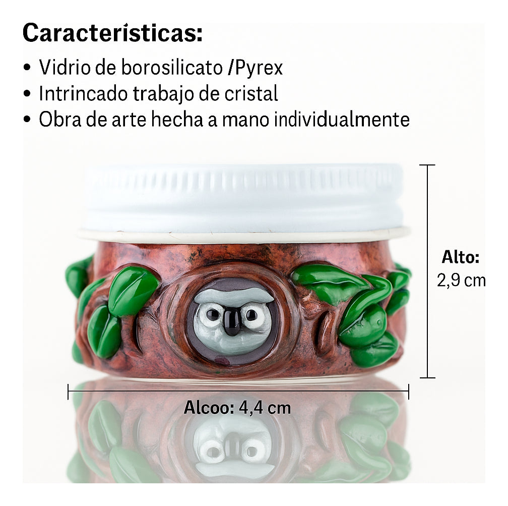 ¿A quién le importa la frescura? Hootie te tiene cubierto con esos antojos de naturaleza con estos Terp Jars. Sellados para mayor frescura y con los amigos del bosque de Hootie, llena tus sentidos con la esencia de la naturaleza (sin tener que moverte del sofá). ¡Renueva tu experiencia !Características:* Vidrio de borosilicato/Pyrex* Intrincado trabajo de cristal* Obra de arte hecha a mano individualmente.* Diseño Forestal de HootieDimensiones:* Alto: 2,9 cm Ancho: 4,4 cmPeso:* 50 gramos